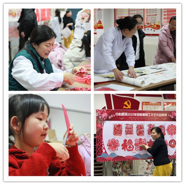 往大廳內部走去,便來到了第二個區(qū)域,這里正在進行剪紙、繪畫和書法才藝展示。參與活動的不僅有職工,還有職工家屬及孩子們。他們個個技藝精湛,穩(wěn)穩(wěn)地坐在座位上,手持剪刀、畫筆、毛筆等工具,動作嫻熟,如行云流水般。片刻之間,一幅幅精美的雙魚戲珠、春回大地、彩蝶雙飛等剪紙,一幅幅山水花鳥等畫作,一個個形態(tài)各異的福字便呈現(xiàn)在大家眼前,引得眾人陣陣驚嘆。