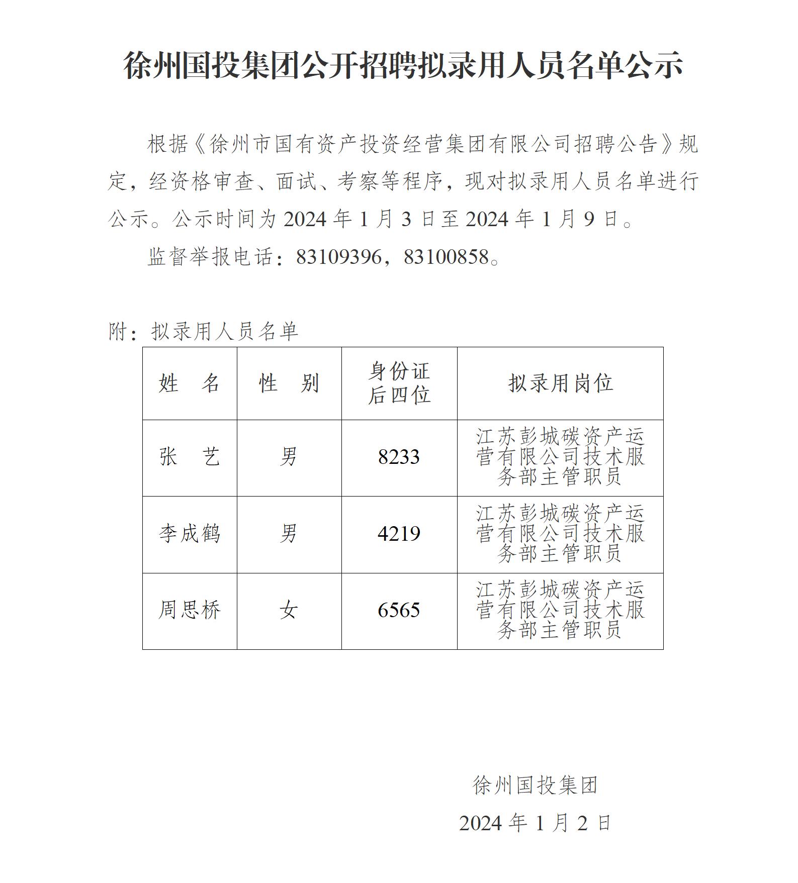 徐州國投集團(tuán)公開招聘擬錄用人員名單公示