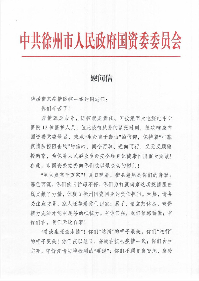 市國資委向馳援南京新冠疫情防控一線的徐州國投大屯煤電中心醫(yī)院的同志致慰問信