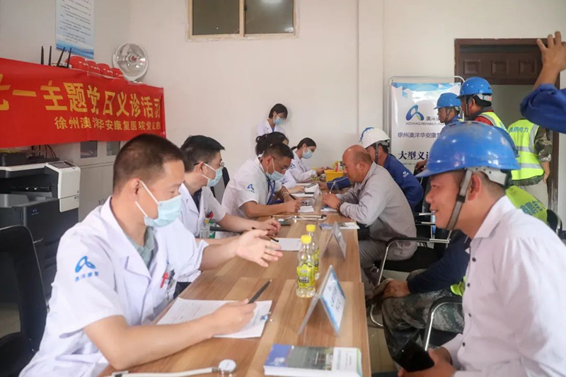 徐州澳洋華安康復醫(yī)院的醫(yī)務人員深入項目建設(shè)現(xiàn)場,為奮戰(zhàn)在建設(shè)一線的施工及管理人員開展義診活動?;顒又?,醫(yī)療專家和醫(yī)護團隊細心嚴謹為每一位一線工人進行血壓血糖檢測、用藥指導、身心健康問題解答等。本次義診活動現(xiàn)場氣氛和諧融洽,讓項目全體員工深切感受到了黨組織的溫暖和關(guān)懷。