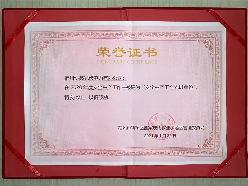 2021年2月1日,在國(guó)家現(xiàn)代農(nóng)業(yè)示范區(qū)管委會(huì)召開的年度安全工作會(huì)議上,管委會(huì)對(duì)國(guó)投環(huán)能公司所屬宿州協(xié)鑫光伏電站2020年度安全生產(chǎn)工作總體情況進(jìn)行通報(bào),對(duì)人員持證上崗、安全目標(biāo)責(zé)任書的落實(shí)以及電站各項(xiàng)安全宣貫培訓(xùn)等工作做出高度評(píng)價(jià),授予國(guó)投環(huán)能公司所屬宿州協(xié)鑫光伏電站2020年度“安全生產(chǎn)工作先進(jìn)單位”榮譽(yù)稱號(hào)。