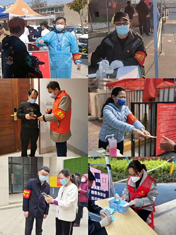 機關(guān)一支部書記陳杰帶領(lǐng)妻子和女兒一家三口齊上陣,全部都當上抗疫志愿者;遠大支部書記趙明芳既在北望小區(qū)廣場核酸檢測點協(xié)助做好體溫測量等工作,又兼顧做好“疫”后公司復(fù)工復(fù)產(chǎn)的工作部署;勞代支部副書記朱文華堅守在徐州人家小區(qū)南門,當好小區(qū)“守門員”;新亞支部書記陳航除每日做好最新通知傳達、工作安排以外,返徐家人“3+11”健康監(jiān)測期滿后,他就報名參加了山語世家核酸檢測點查驗兩碼等工作;正大支部書記王艷在世茂天域華府檢測點認真開具核酸檢測證明。