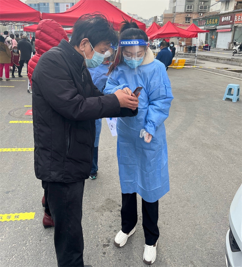 “孩子,謝謝你啊,辛苦了”子房山社區(qū)的爺爺奶奶們對王雪斐說道。王雪斐是國泰公司一名90后青年,第一次去子房山社區(qū)做核酸檢測時(shí),她發(fā)現(xiàn)社區(qū)里面老年人比較多,因?yàn)椴粫脙纱a造成檢測效率低,老年人排隊(duì)時(shí)間久,急需一個(gè)能夠主動幫助老年人的志愿者。她打定主意后,聯(lián)系社區(qū)加入了戰(zhàn)疫工作,在完成發(fā)放防疫物資、出入證件、維持隊(duì)伍秩序、登記居民信息的基礎(chǔ)工作間隙,她還主動幫助爺爺奶奶們打開兩碼、耐心的告知核酸檢測時(shí)間和注意事項(xiàng)。一天下來,忙前忙后,她卻滿不在乎地說道:“不要緊,疫情就是命令,為了人民的利益,為了戰(zhàn)疫的勝利,我們青年人就是戰(zhàn)疫的一塊磚,哪里需要哪里搬。”
