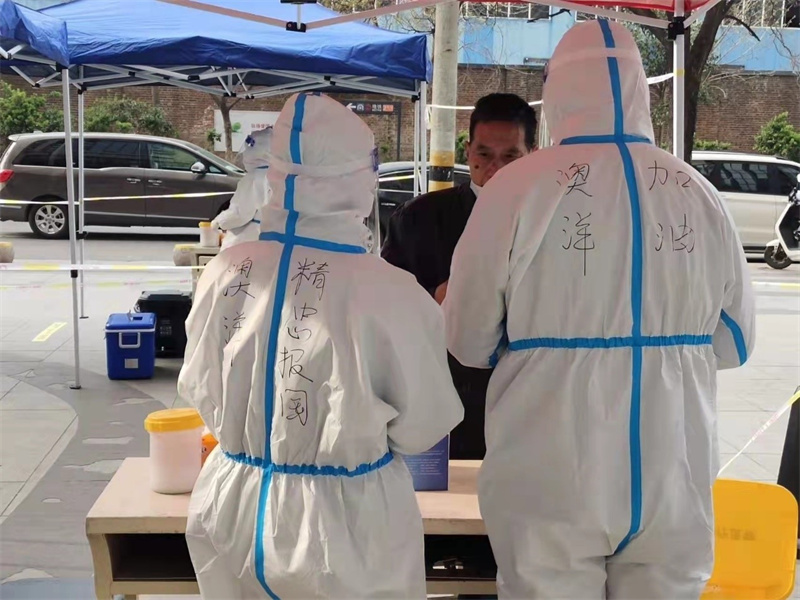 徐州澳洋華安康復(fù)醫(yī)院核酸檢測應(yīng)急分隊(duì)共50名團(tuán)員參與此次核酸檢測任務(wù),團(tuán)員們火速支援各個(gè)社區(qū),與社區(qū)志愿者們瞬間成為戰(zhàn)友,團(tuán)支部副書記張毛妮說:“在這里,我們穿著防護(hù)服,帶著口罩、防護(hù)面屏、手套……密閉的防護(hù)衣悶熱的全身大汗淋漓,厚厚的手套使平時(shí)操作起來很簡單的動作變得困難,面罩和口罩給臉上留下了一道道印痕,一遍遍抬手臂胳膊酸疼,長時(shí)間的彎腰站立后腰背疼痛……但是看到市民們井然有序的排著隊(duì)伍,社區(qū)志愿者們熱心主動的幫忙,聽到完成采集的市民一句‘謝謝’,我們知道,我們的付出和辛苦是值得的?!笨箵粢咔?,青年先行,徐州澳洋華安康復(fù)醫(yī)院團(tuán)支部高舉“聚是一團(tuán)火,散是滿天星”的團(tuán)結(jié)之炬,不畏艱苦、砥礪前行,為早日打贏這場疫情防控狙擊戰(zhàn)不斷奮斗著!
