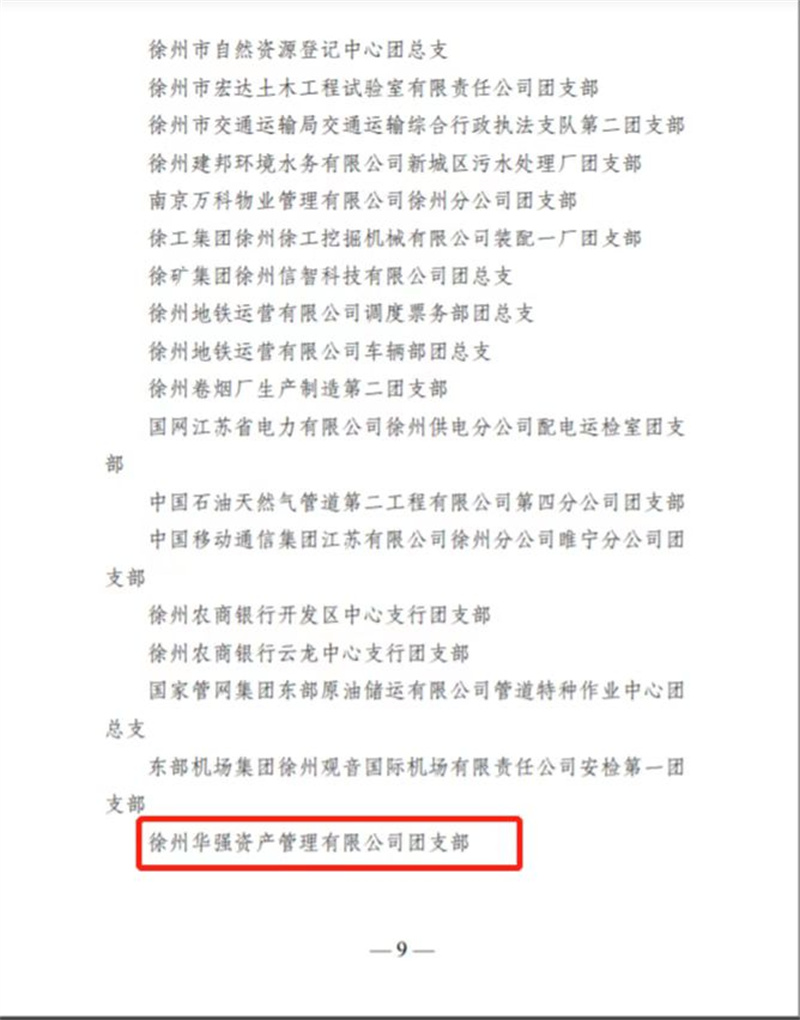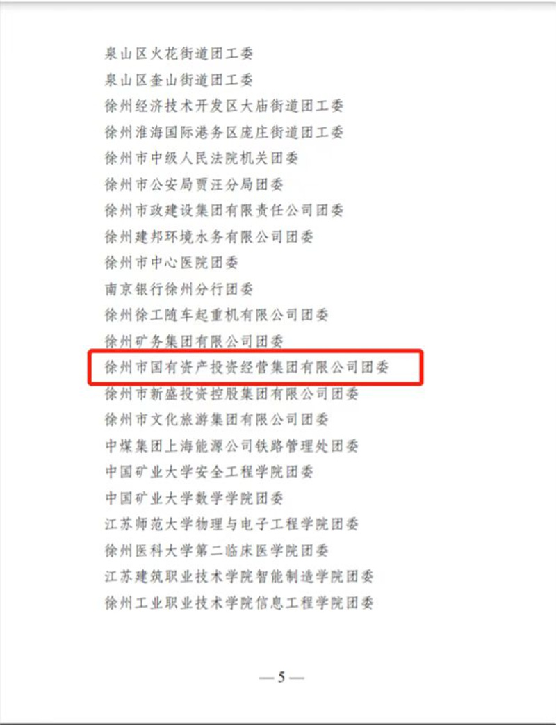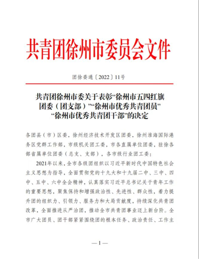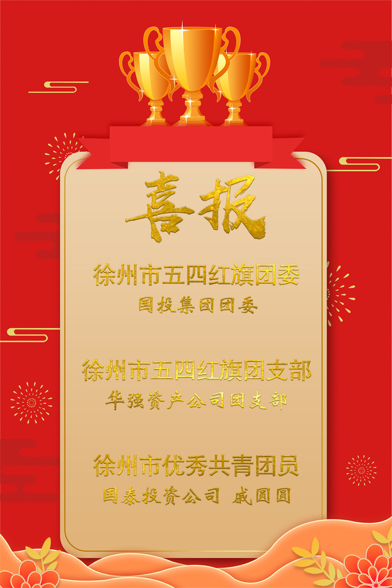 2022年是黨的二十大召開之年,也是中國共青團(tuán)成立100周年。近日,共青團(tuán)徐州市委對(duì)各級(jí)團(tuán)組織及個(gè)人作出表彰。其中,國投集團(tuán)團(tuán)委榮獲“五四紅旗團(tuán)委”稱號(hào)、華強(qiáng)資產(chǎn)公司團(tuán)支部榮獲“五四紅旗團(tuán)支部”稱號(hào),國泰投資公司戚圓圓同志榮獲“優(yōu)秀共青團(tuán)員”稱號(hào)。