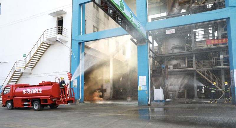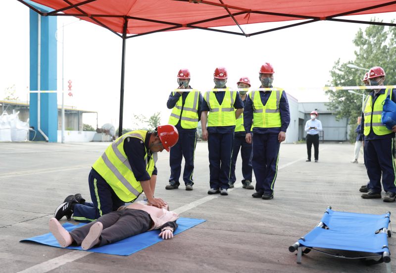 本次應(yīng)急演練活動(dòng)現(xiàn)場(chǎng)位于危廢處置中心危險(xiǎn)廢物焚燒車間,模擬場(chǎng)景設(shè)計(jì)為巡檢人員在更換窯頭噸桶廢液時(shí),由于操作不當(dāng),回流管從收集桶中甩出至地面,廢液飛濺到巡檢人員額面部,造成灼傷。同時(shí),廢液濺至回轉(zhuǎn)窯周邊遇熱燃燒,并點(diǎn)燃回流管不斷涌出的廢液。事故發(fā)生后,危廢中心應(yīng)急救援隊(duì)伍各司其職,消防與搶險(xiǎn)救災(zāi)組使用滅火器、消火栓、消防水炮霧化滅火;警戒保衛(wèi)組對(duì)事故現(xiàn)場(chǎng)警戒;醫(yī)療救護(hù)組對(duì)受傷人員進(jìn)行心肺復(fù)蘇急救,將受傷員工外送就醫(yī);環(huán)境保護(hù)組打開(kāi)應(yīng)急水池閘門(mén),做好消防水及洗消水的收集工作。通過(guò)各現(xiàn)場(chǎng)應(yīng)急救援組織機(jī)構(gòu)協(xié)同努力,緊急情況得以解除,現(xiàn)場(chǎng)經(jīng)洗消檢驗(yàn)后恢復(fù)正常狀態(tài)。