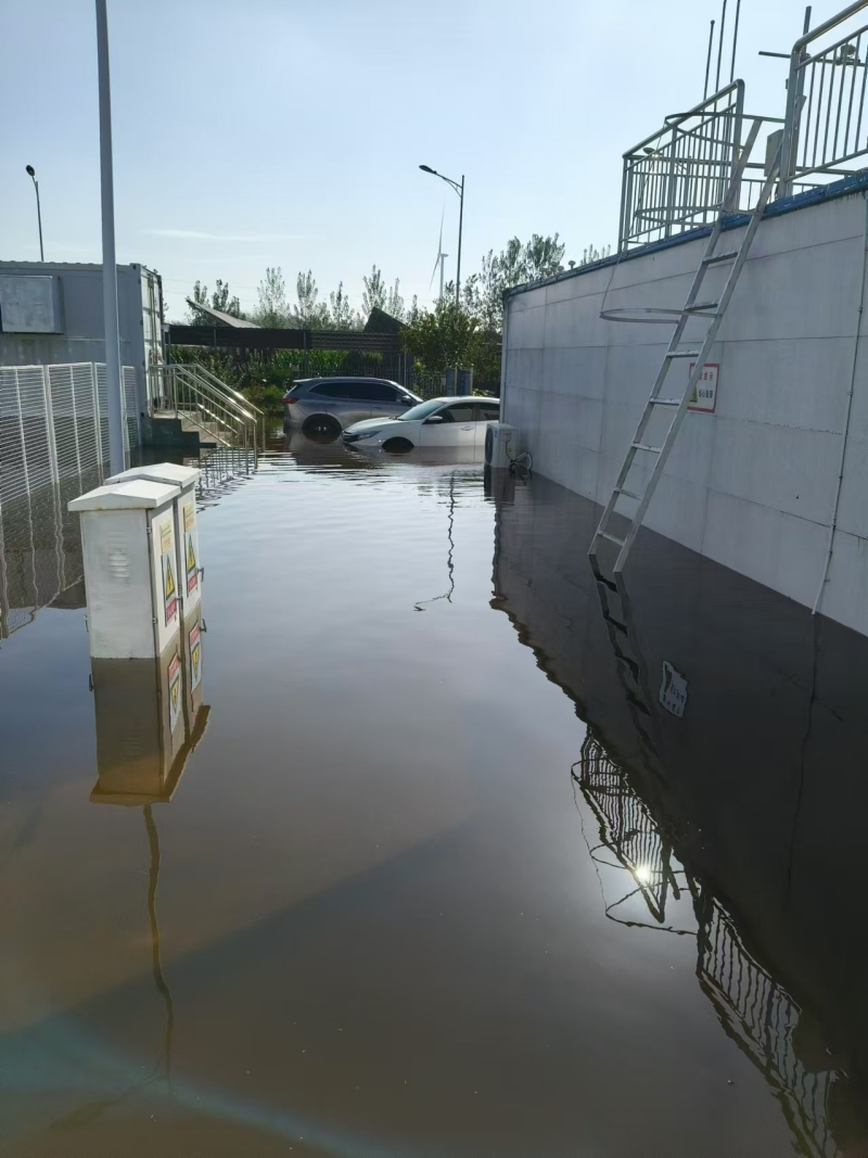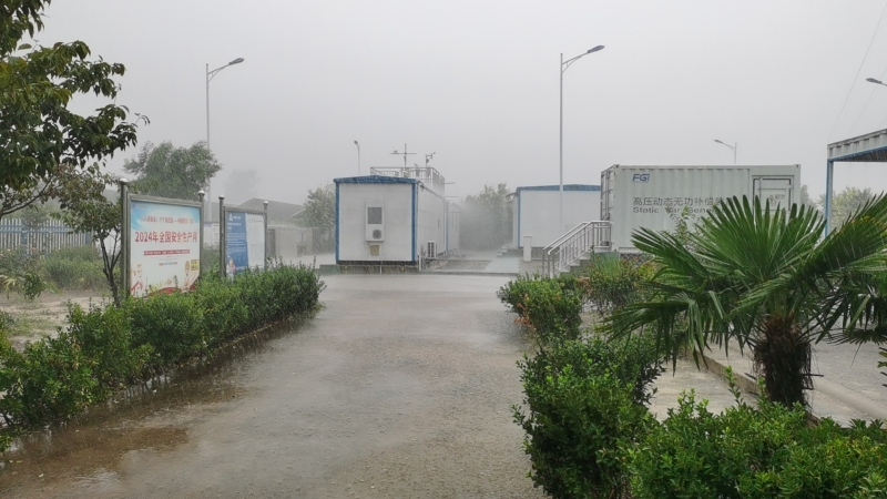 狂風暴雨自9月17日12點來襲,由于碭山鑫能電站所處地勢低洼,很快形成積水。電站人員首先切斷了電動門、生活水泵、電纜溝風機等設(shè)備電源,防止因進水短路可能引發(fā)的安全事故;將400V低壓ATS電源由常用模式切換至備用模式,并將35KV站用接地變514開關(guān)由運行轉(zhuǎn)冷備用,防止因水位上升對設(shè)備的影響。