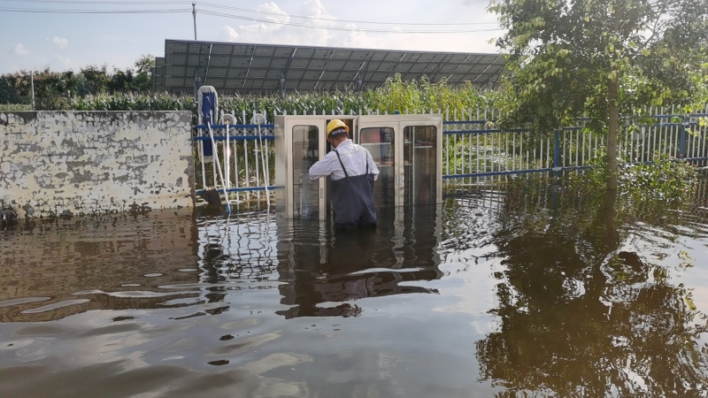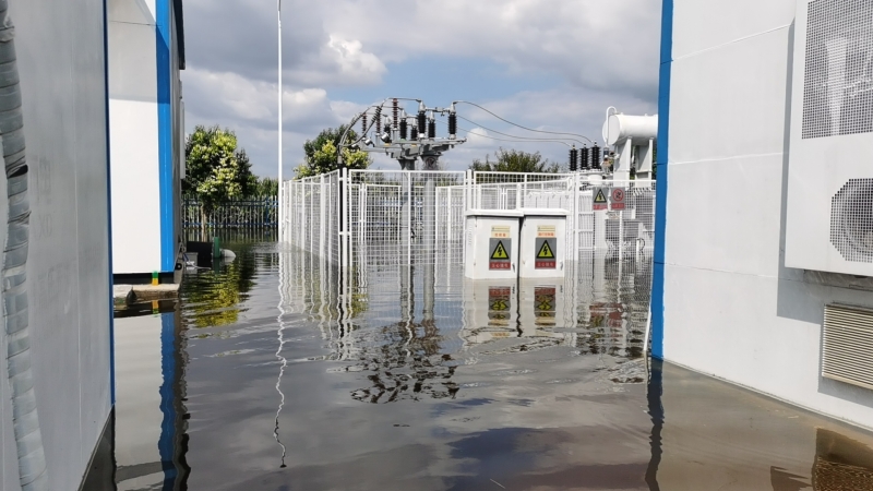 雨勢越來越猛,積水也越積越多,同時電站外面的積水也在向內(nèi)倒灌,遠遠望去,站內(nèi)的積水和周邊村莊田地連成一片汪洋。劉忠??粗e水高度的逐步上漲,先是淹到了腳踝,后來是空調(diào)外機,眼瞅著已經(jīng)到了控制室和設(shè)備艙的臺階處,“于紀瑤,你跟我一起去查看積水情況!”兩人合力將地板掀開,看到下面已經(jīng)是積水?!?0公分,再升高10公分,設(shè)備就會產(chǎn)生巨大損壞,也會造成短路風險”劉忠保心里盤算著,“可是現(xiàn)在拉閘,發(fā)電量也會造成損失?!彼才烹娬救藛T白天全員在崗、夜間輪換值班,通過24小時不間斷值守對站內(nèi)重要設(shè)施進行高頻率水位監(jiān)視,密切關(guān)注電纜溝水位與高壓開關(guān)柜底部距離、接地變附近水位以及一次、二次室內(nèi)部濕度情況,力爭撐到最后的安全線再拉閘,將損失降到最低。