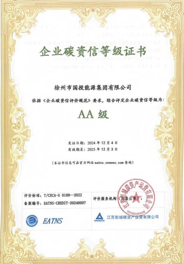 近日,在江蘇彭城碳資產(chǎn)運營有限公司的專業(yè)咨詢協(xié)助下,經(jīng)華測認證有限公司專家組的嚴格評審,能源集團成功通過碳管理體系認證審核,并獲得由上海環(huán)境能源交易所頒發(fā)的EATNS碳管理體系證書,成為全市率先獲得該體系認證的企業(yè)。同時,碳資信評價等級實現(xiàn)AA,標志著企業(yè)在“雙碳”管理工作方面取得了重大突破。