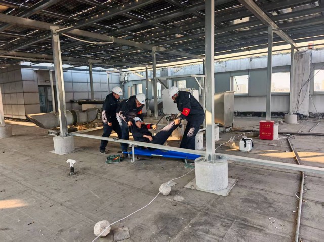 演練緊扣“安全第一、預(yù)防為主、綜合治理”方針,模擬電站運(yùn)維人員在屋頂進(jìn)行逆變器檢修時(shí),不慎觸及裸露電纜導(dǎo)致觸電昏迷的緊急場(chǎng)景?;顒?dòng)現(xiàn)場(chǎng),隨著總指揮一聲令下,演練正式拉開序幕。參演人員迅速進(jìn)入角色,從事故發(fā)現(xiàn)、電源切斷、脫離電源、現(xiàn)場(chǎng)救護(hù)到啟動(dòng)心肺復(fù)蘇、撥打急救電話,整個(gè)流程緊張有序、銜接緊密?,F(xiàn)場(chǎng)救援人員反應(yīng)迅速、操作規(guī)范,充分展現(xiàn)了扎實(shí)的安全技能和高效的團(tuán)隊(duì)協(xié)作能力。