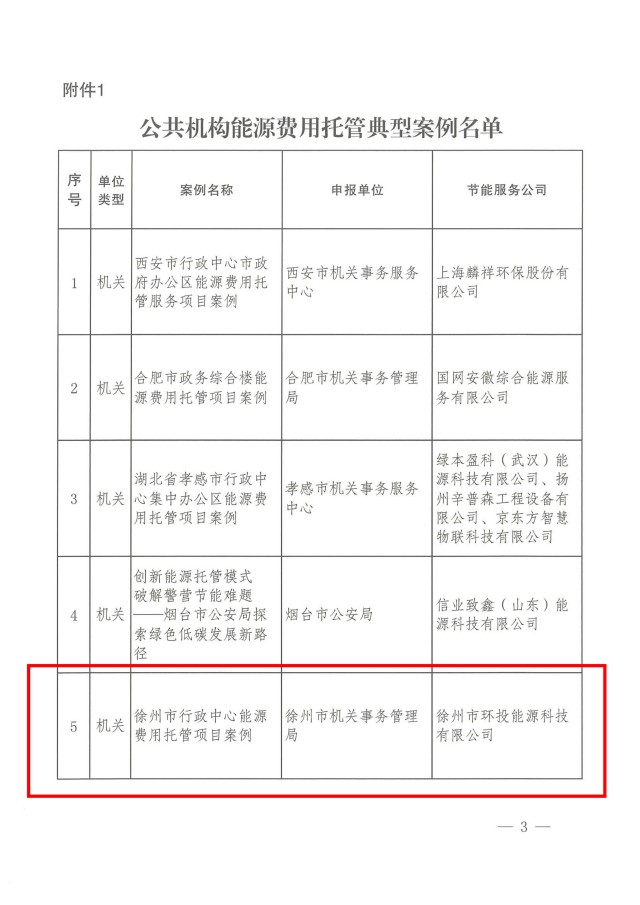 近日,國管局辦公室、國家發(fā)展改革委辦公廳、財(cái)政部辦公廳聯(lián)合發(fā)文,發(fā)布全國公共機(jī)構(gòu)能源費(fèi)用托管30個(gè)典型案例和25個(gè)入圍案例名單,徐州市環(huán)投能源科技有限公司(簡稱“環(huán)投公司”)托管服務(wù)的《徐州市行政中心能源費(fèi)用托管項(xiàng)目》被評定為典型案例。