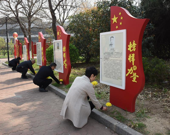 4月3日上午9時許,全體參與人員在會議室集中,利用彩紙、鐵絲等簡單的材料親自動手制作絹花,只見大家有的折紙、有的剪裁,寧靜而肅穆的制作,表達(dá)著我們對英雄發(fā)自肺腑的哀思和敬意。制作完成后,大家來到黨建文化園《榜樣的力量》專題區(qū),手捧花束依次排開,向革命先輩深深鞠躬并默哀,將親手制作的絹花整齊擺放在展板前。隨后,機(jī)關(guān)支部黨員代表就榜樣專題事跡向大家做了分享交流,感悟他們?yōu)榱斯伯a(chǎn)主義信仰英勇獻(xiàn)身的光輝事跡。最后,大家來到黨建園的宣誓區(qū),舉起右手,莊嚴(yán)宣誓,重溫入黨誓詞、重悟入黨初心?;顒咏Y(jié)束后,大家紛紛駐足在園區(qū)的不同專欄,認(rèn)真瀏覽、細(xì)細(xì)品讀,久久不舍離去。